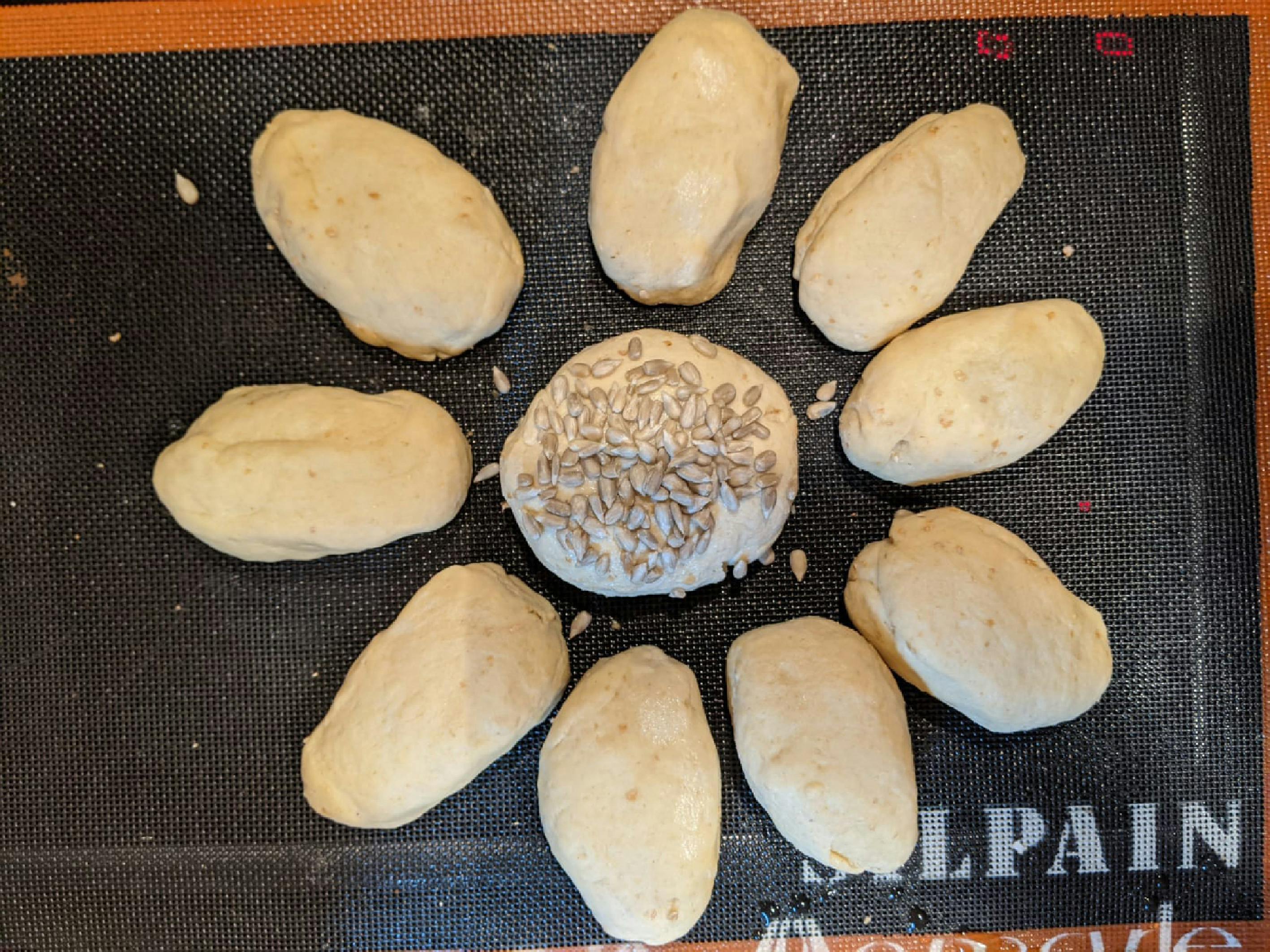 8. Backfolie gut mit Mehl bestäuben und die Teiglinge darauf verteilen. Obendrauf nochmals gut bemehlen und mit einem scharfen nassen Messer einritzen.