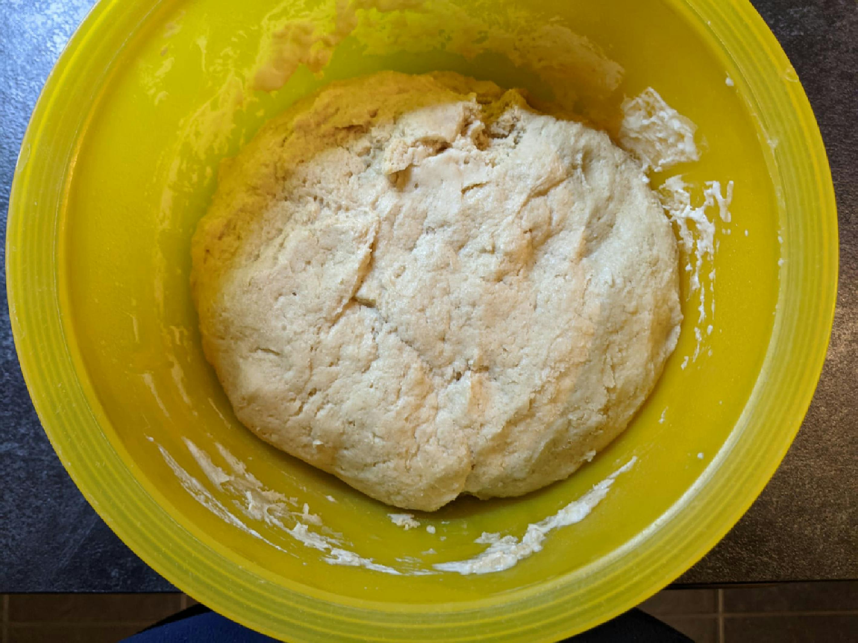 3. Salz und Mehl mischen, nun alles zu einem geschmeidigen Teig verkneten, Teig klebt nicht. Nun zugedeckt in einer Schüssel über Nacht im Kühlschrank ruhen lassen.