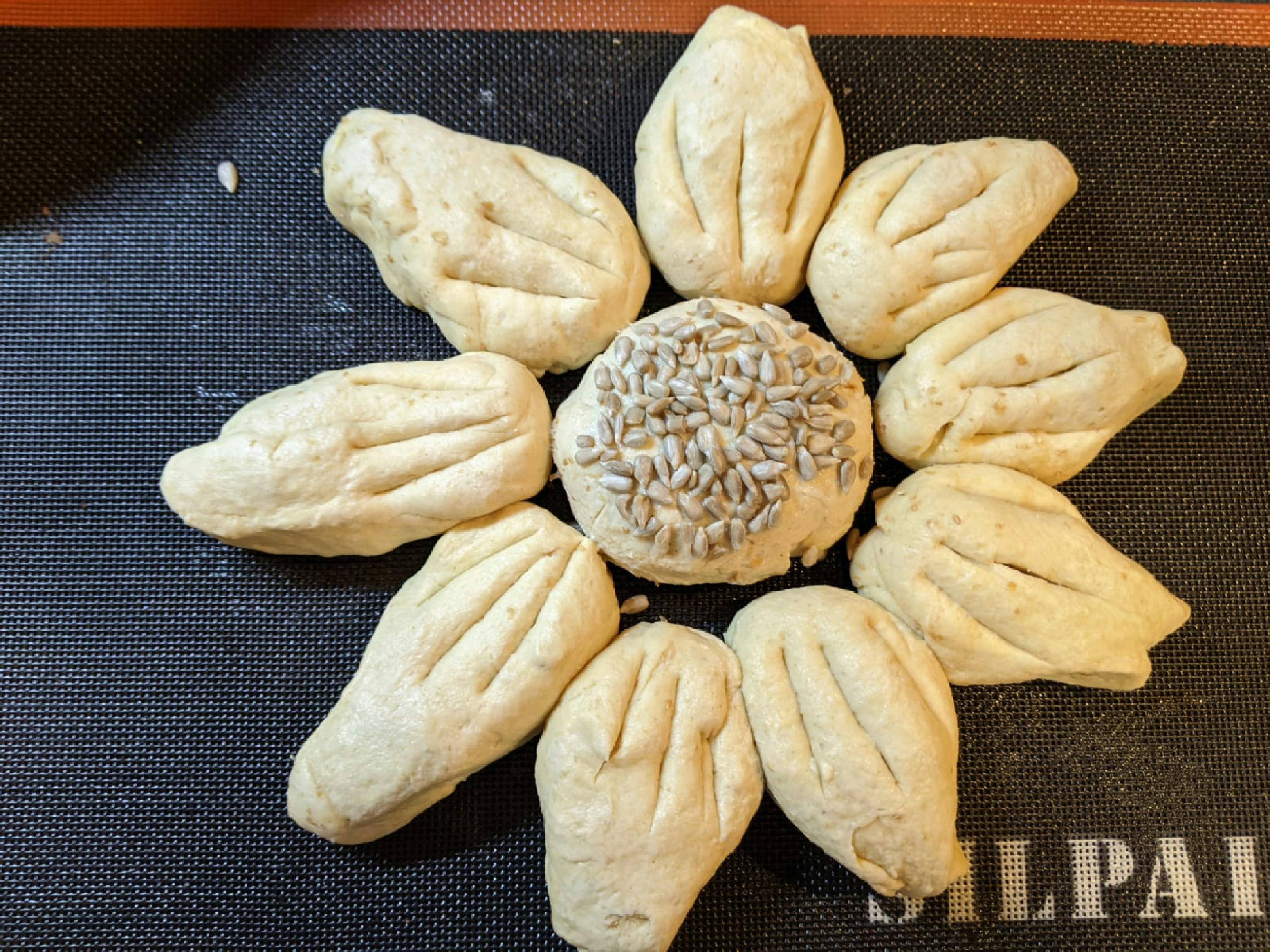 Um die kalte Jahreszeit zu überbrücken und den grauen Tagen entgegenzuwirken, heißen wir den Frühling mit dieser Brot-Sonnenblume willkommen. Nicht nur kann mit ihr bereits zu frühen Stunden ein Lächeln auf morgenmuffelige Gesichter gezaubert werden, sondern eignet sich dieses blumige Backwerk auch für längere Brunchs, Party-Buffets oder ein gediegenes Mittagessen.